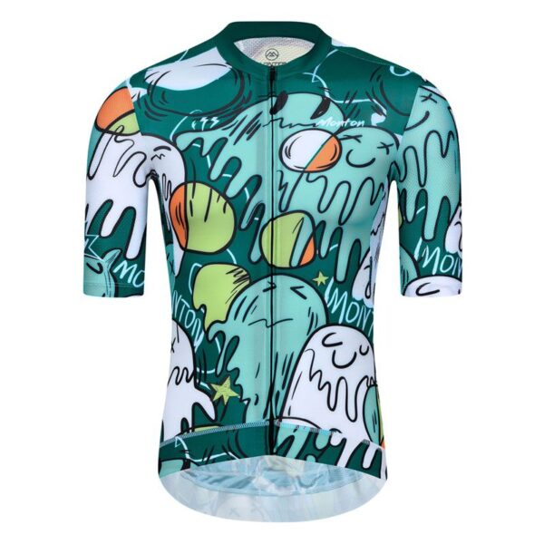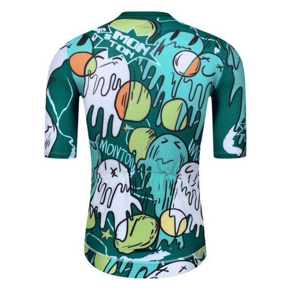 Maillot ciclista Monton de ajuste relajado, verde, con bolsillo con cremallera, gráficos divertidos de bolas de nieve derretidas. Maillot ciclista de verano de manga corta a buen precio para andar en bicicleta.