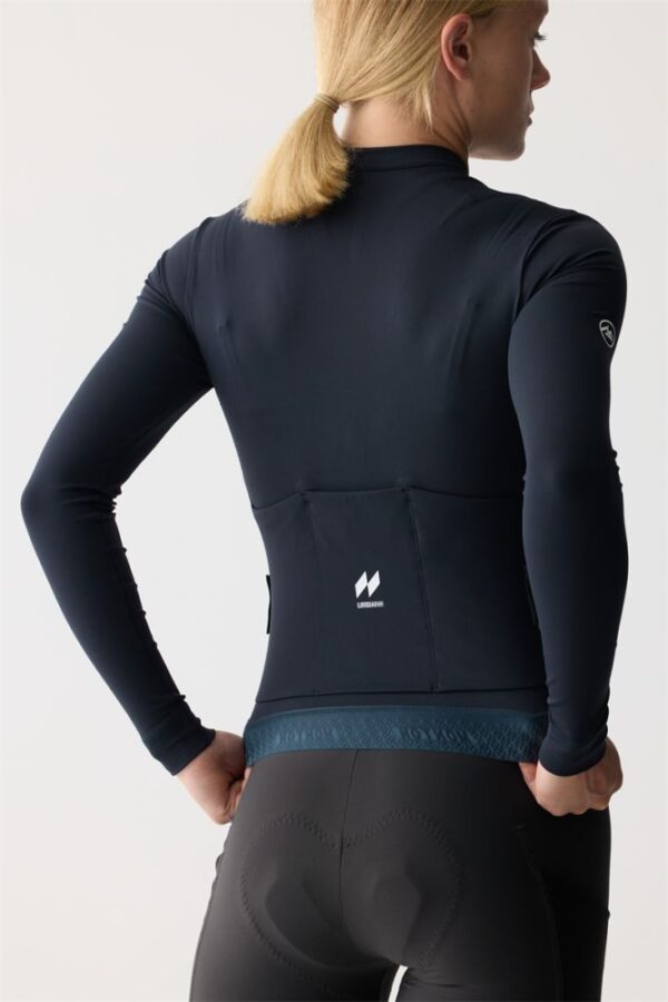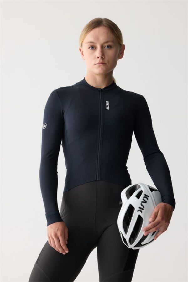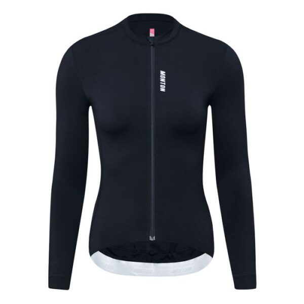 El maillot ciclista de manga larga para mujer Monton Urban+ de peso medio negro azul es perfecto para montar en climas más fríos en primavera y otoño, ya que proporciona un excelente soporte y comodidad para los ciclistas.